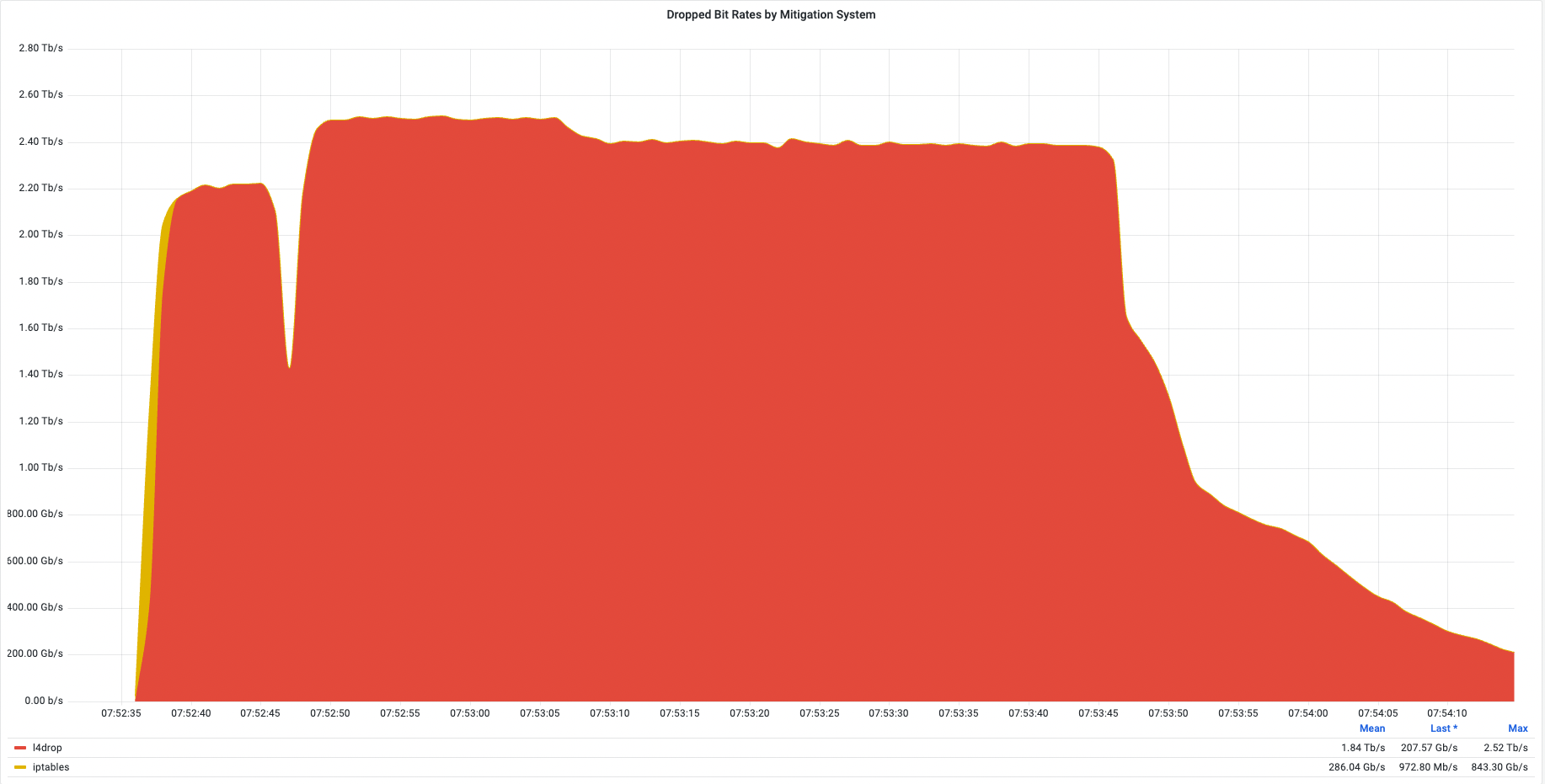Copy linkEven with the largest attacks, such as the 2.5 Tbps attack we mitigated earlier this quarter, and the 26M request per second attack we mitigated back in the summer, the peak of the attacks were short-lived. The entire 2.5 Tbps attack lasted about 2 minutes, and the peak of the 26M rps attack only 15 seconds. This emphasizes the need for automated, always-on solutions. Security teams can’t respond quick enough. By the time the security engineer looks at the PagerDuty notification on their phone, the attack has subsided.