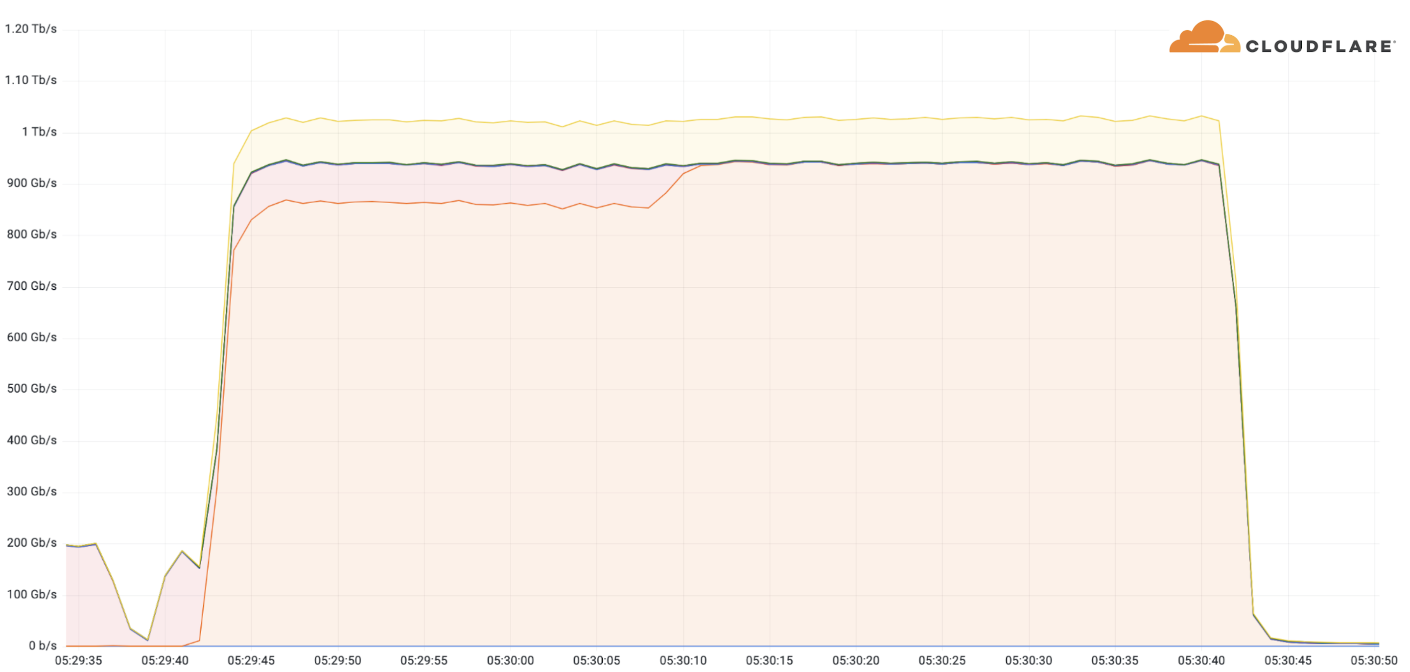 Copy linkBelow is an example of one of those attacks exceeding 100 Gbps that took place the week after Thanksgiving. This was a 1 Tbps DDoS attack targeted at a Korean-based hosting provider. This particular attack was an ACK flood and it lasted roughly one minute. Since the hosting provider was using Magic Transit, Cloudflare’s L3 DDoS protection service, the attack was automatically detected and mitigated.