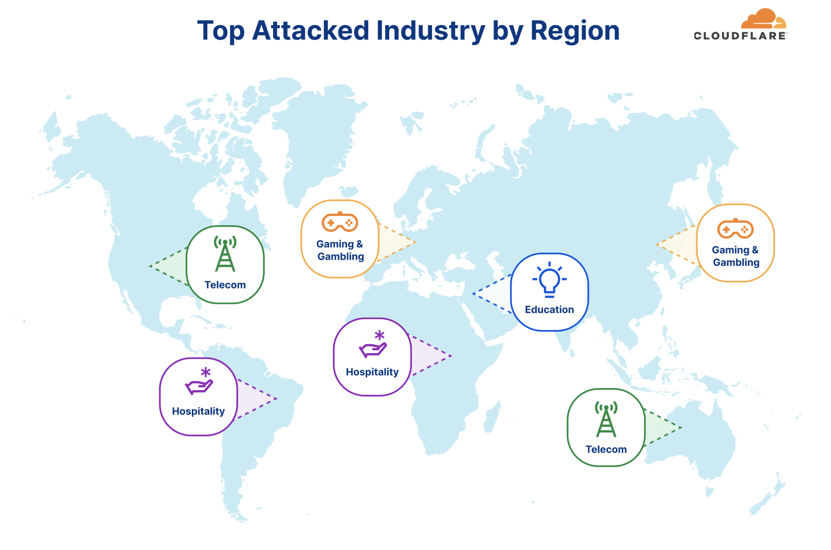 Over 52% of all traffic recorded in Cloudflare’s data centers in Botswana was network-layer DDoS attack traffic. Similarly, in Cloudflare’s data centers in Azerbaijan, Paraguay, and Palestine, network-layer DDoS attack traffic constituted approximately 40% of all traffic.