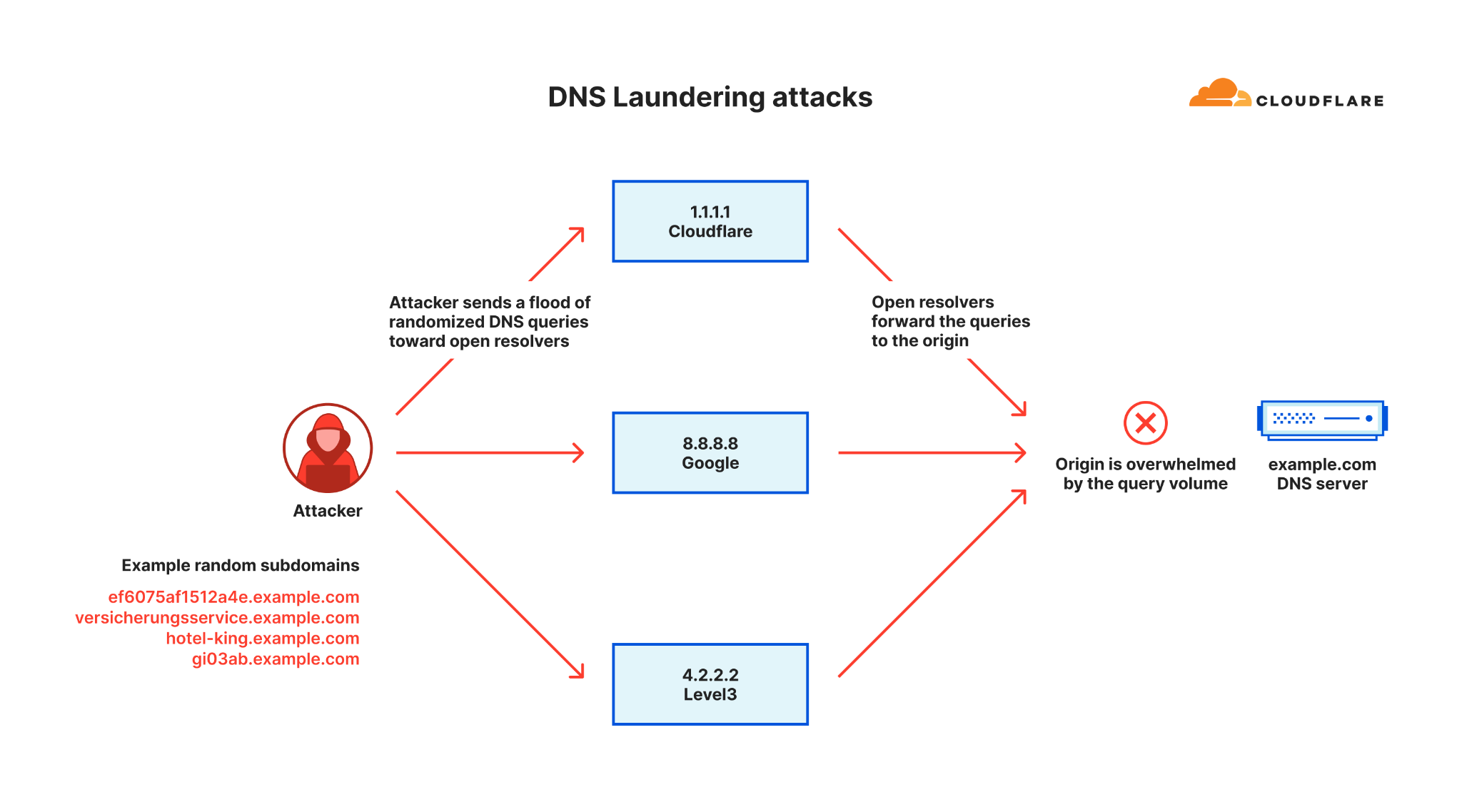 In a DNS Laundering attack, the threat actor will query subdomains of a domain that is managed by the victim’s DNS server. The prefix that defines the subdomain is randomized and is never used more than once or twice in such an attack. Due to the randomization element, recursive DNS servers will never have a cached response and will need to forward the query to the victim’s authoritative DNS server. The authoritative DNS server is then bombarded by so many queries until it cannot serve legitimate queries or even crashes all together.
