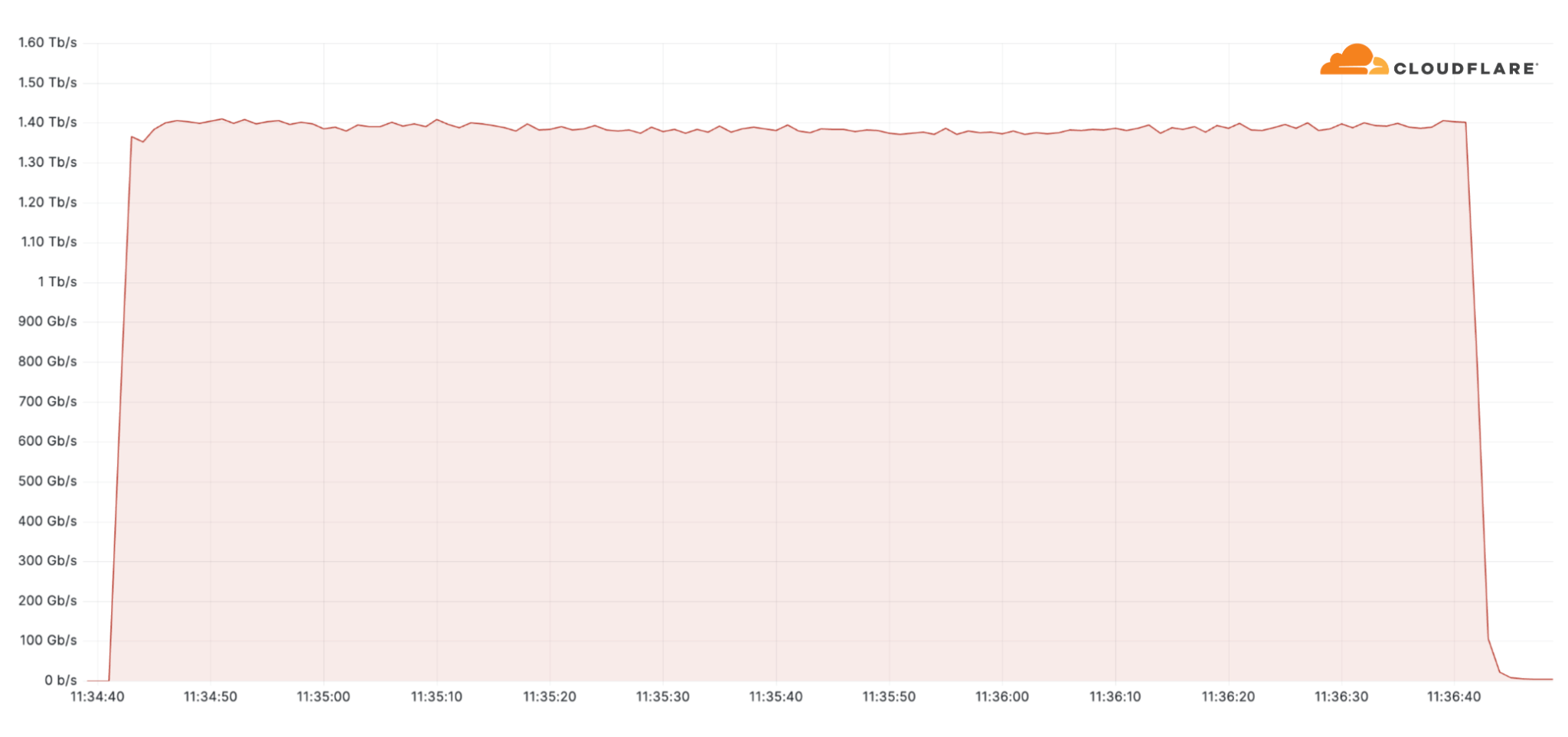 Additionally, one of the largest attacks we’ve seen this quarter was an ACK flood DDoS attack which originated from a Mirai-variant botnet comprising approximately 11K IP addresses. The attack targeted an American Internet Service Provider. It peaked at 1.4 terabit per seconds (Tbps) and was automatically detected and mitigated by Cloudflare’s systems.