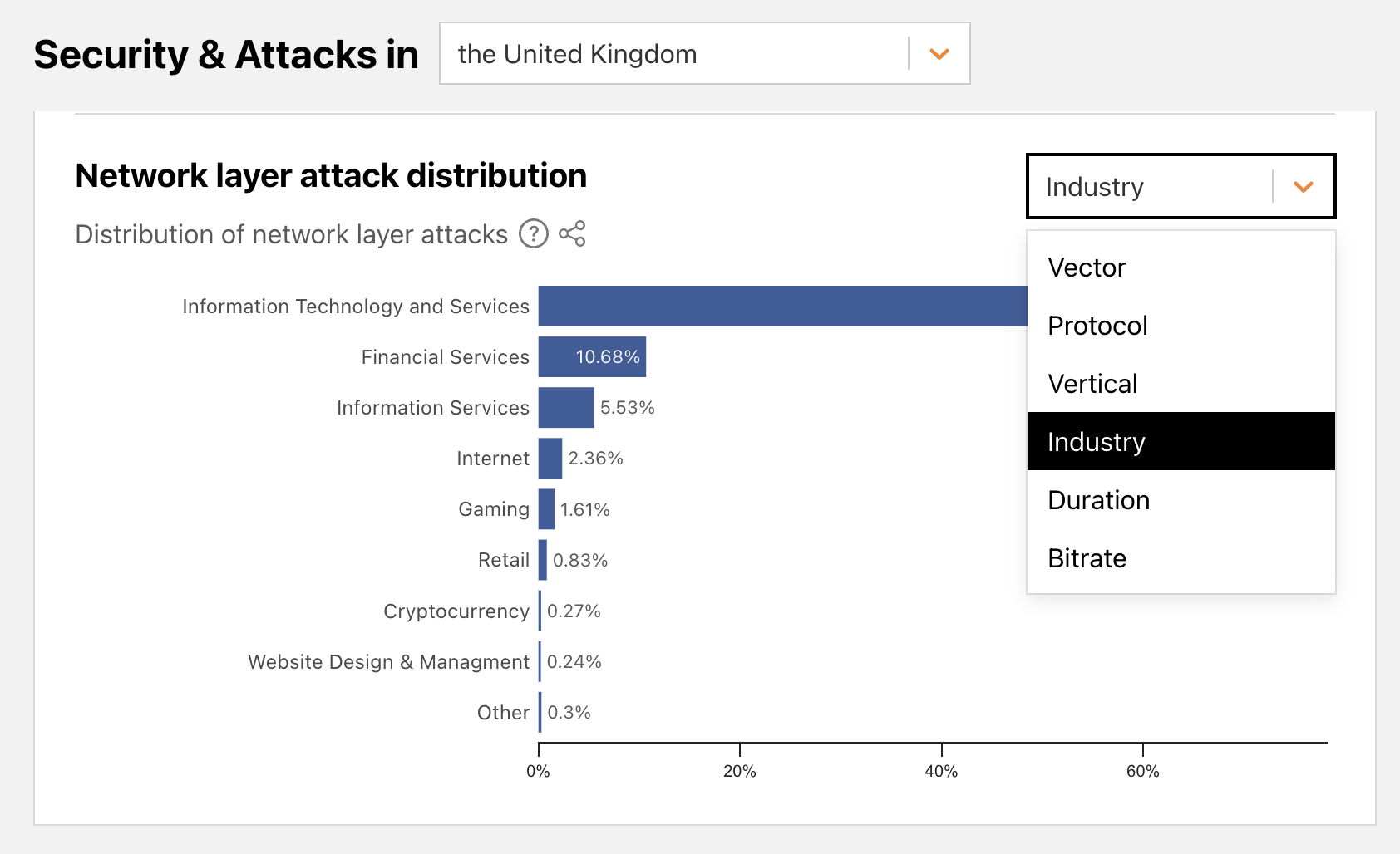 Copy linkFor both application-layer and network-layer DDoS attacks, we group attacks and traffic by our customers’ industry according to our customer relations management system. This lets us understand which industries are subject to more attacks.