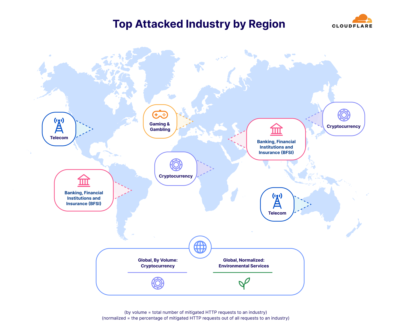 Similar to Singapore, but arguably more dramatic, China is both the number one most attacked country by network-layer DDoS attack traffic, and also with respect to all China-bound traffic. Almost 86% of all China-bound traffic was mitigated by Cloudflare as network-layer DDoS attacks. The Palestinian territories, Brazil, Norway, and again Singapore followed with large percentages of attack traffic.
