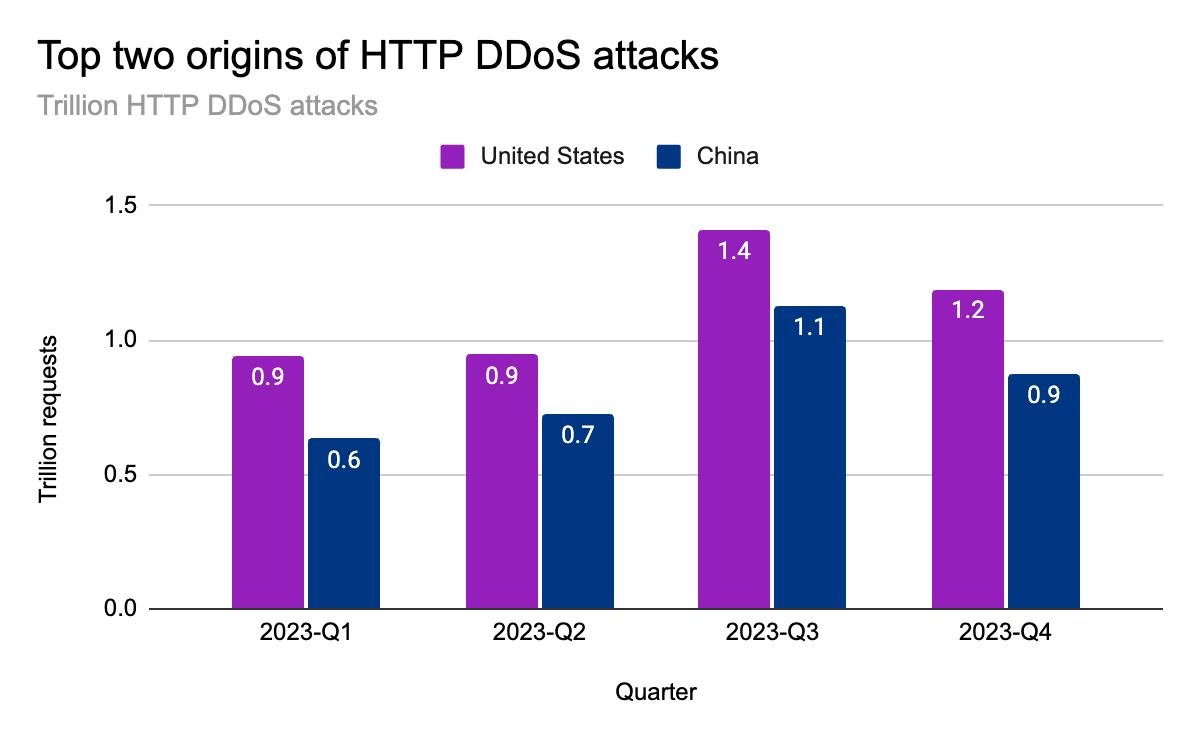 Copy linkIn the third quarter of 2022, China was the largest source of HTTP DDoS attack traffic. However, since the fourth quarter of 2022, the US took the first place as the largest source of HTTP DDoS attacks and has maintained that undesirable position for five consecutive quarters. Similarly, our data centers in the US are the ones ingesting the most network-layer DDoS attack traffic — over 38% of all attack bytes.