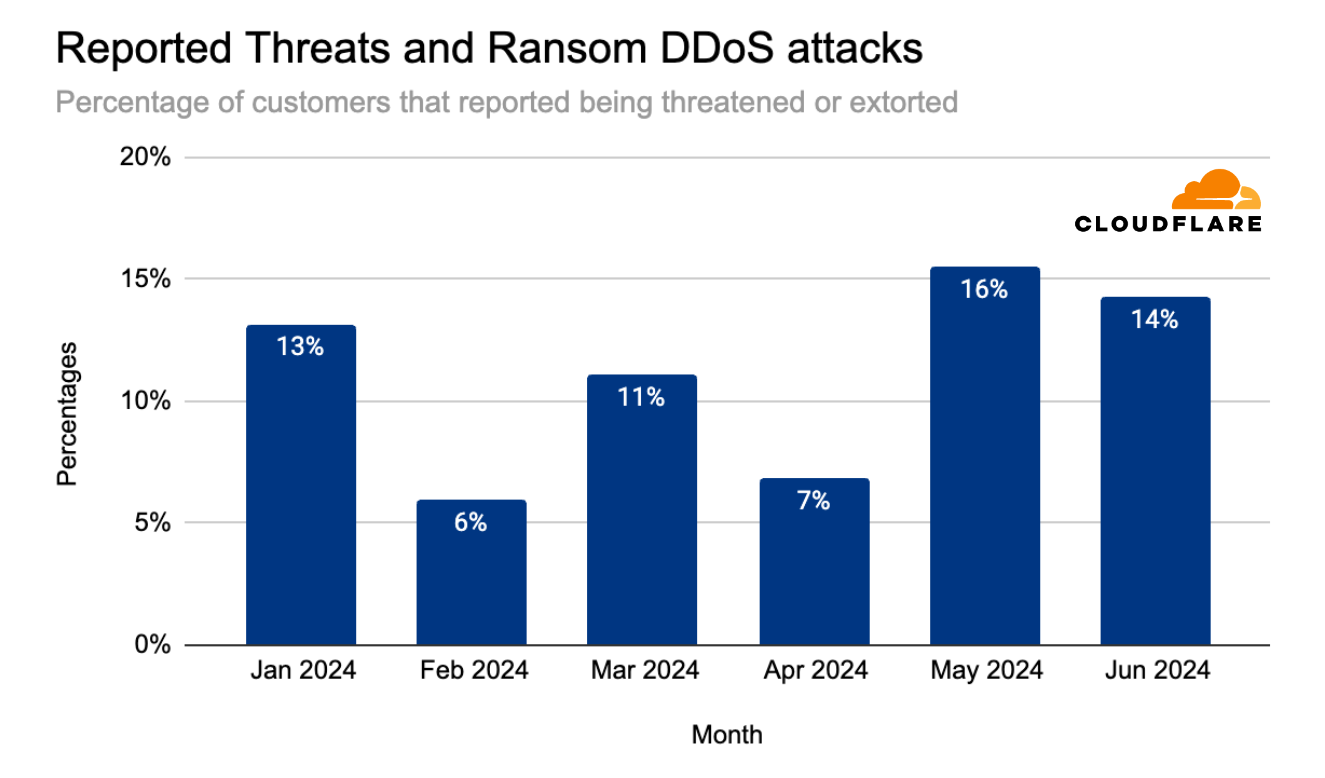 Copy linkIn May 2024, the percentage of attacked Cloudflare customers that reported being threatened by a DDoS attack threat actor, or subjected to a Ransom DDoS attack reached 16% – the highest it’s been in the past 12 months. The quarter started relatively low, at 7% of customers reporting a threat or a ransom attack. That quickly jumped to 16% in May and slightly dipped in June to 14%.