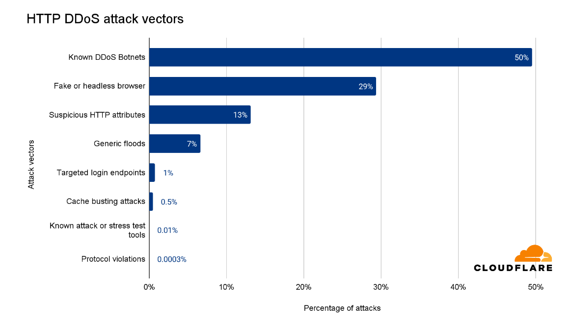 Copy linkOne of the advantages of operating a large network is that we see a lot of traffic and attacks. This helps us improve our detection and mitigation systems to protect our customers. In the last quarter, half of all HTTP DDoS attacks were mitigated using proprietary heuristics that targeted botnets known to Cloudflare. These heuristics guide our systems on how to generate a real-time fingerprint to match against the attacks.