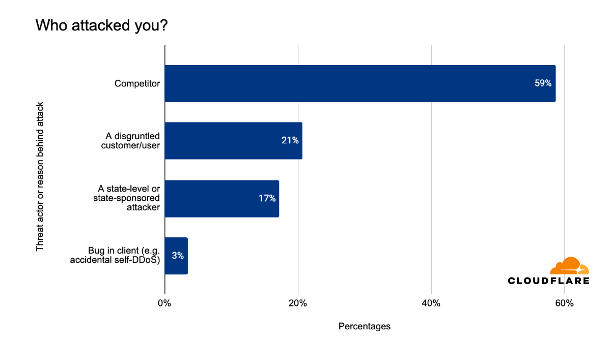 Of the respondents that claim they did know, 59% said it was a competitor who attacked them. Another 21% said the DDoS attack was carried out by a disgruntled customer or user, and another 17% said that the attacks were carried out by state-level or state-sponsored threat actors. The remaining 3% reported it being a self-inflicted DDoS attack.