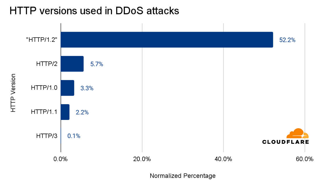 While 80% of DDoS attack requests were over HTTP/2 and 19% were over HTTP/1.1, they represented a much smaller portion when normalized by the total traffic by version. When we normalize the attack requests by all requests by version, we see a different picture. Over half of traffic to the non-standard or mislabeled “HTTP/1.2” version was malicious and part of DDoS attacks. It's important to note that “HTTP/1.2” is not an official version of the protocol.