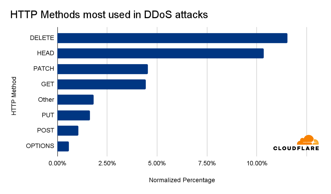 Almost 12% of all requests that used the DELETE method were part of an HTTP DDoS attack. After DELETE, we see that HEAD, PATCH and GET are the methods most commonly used in DDoS attack requests.