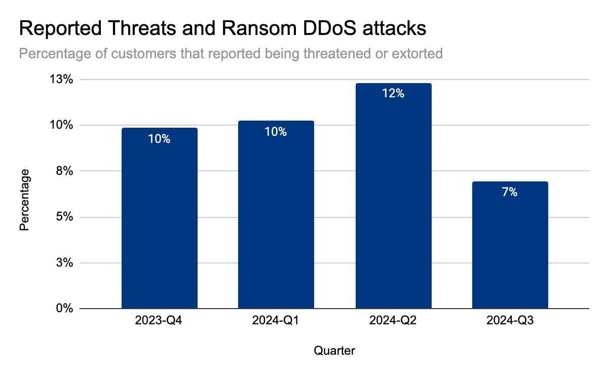 While extortionists were the most common threat actor, overall, reports of Ransom DDoS attacks decreased by 42% QoQ, but increased 17% YoY. A total of 7% of respondents reported being subjected to a Ransom DDoS attack or threatened by the attacker. In August, however, that figure increased to 10% — that’s one out of ten.