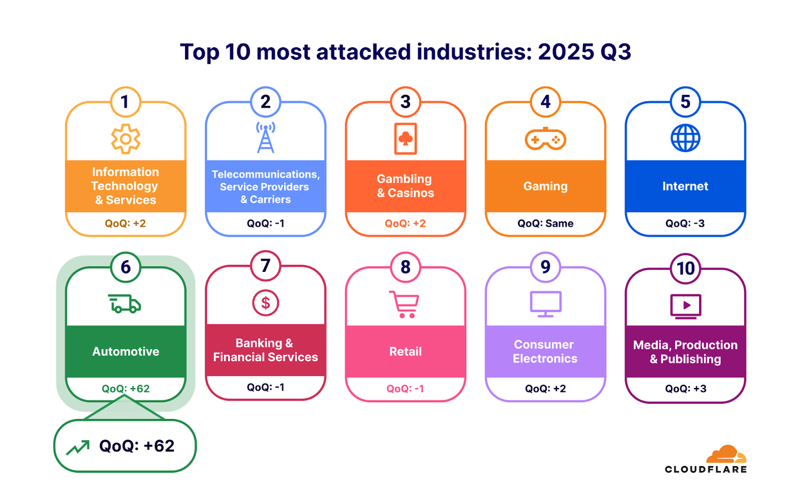 In the third quarter of 2025, Information Technology & Services topped the list as the most attacked industry, followed by Telecommunications, and Gambling & Casinos. Notably, Automotive surged dramatically by 62 spots QoQ. Media, Production & Publishing also saw a sharp rise, preceded by the Banking & Financial Services industry, the Retail industry, and the Consumer Electronics industry.