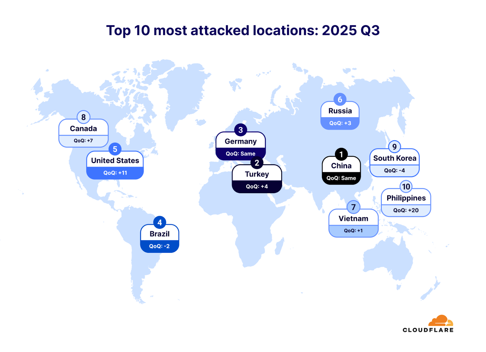 In the third quarter of 2025, China remained the most attacked, followed by Turkey in second, and Germany in third place. The most notable changes within this quarter was an increase in DDoS attacks against the United States, which leaped by 11 spots as the fifth most attacked country. The Philippines saw the largest increase within the top 10 – it jumped by 20 spots.