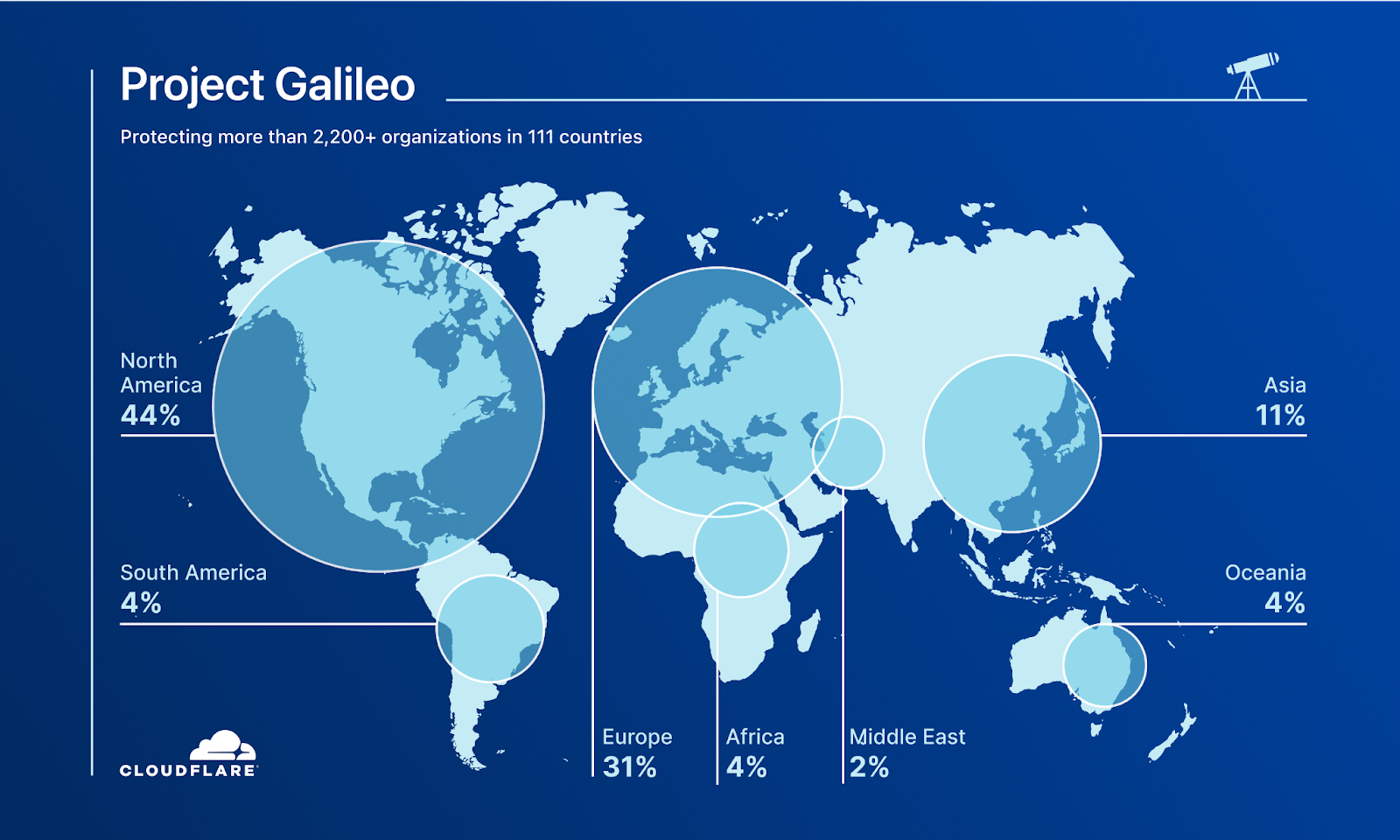 We protect a range of organizations across Project Galileo, with 2,200+ domains in 111 countries. These organizations work in areas that include promoting and protecting human rights, assistance and protection for victims of armed conflicts, investigative journalists in authoritarian countries, environmental conservation advocates, nonprofits that promote youth development, and more. We have shared many of their stories in the past but want to dive deeper on the types of attacks we see against these groups with the hope of better equipping researchers, civil society, and organizations with best practices for safeguarding their online presence.